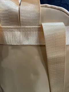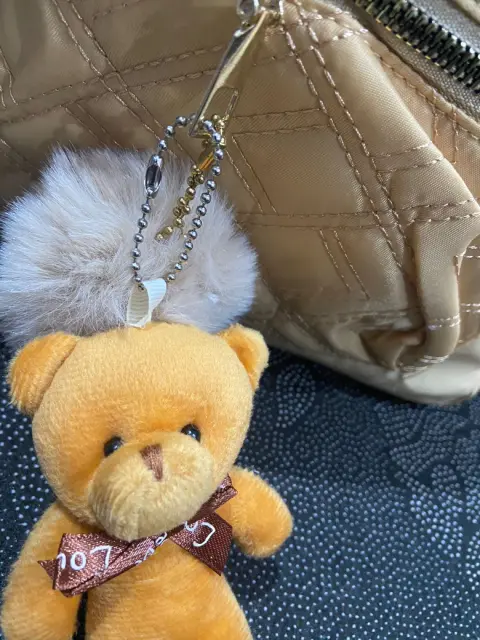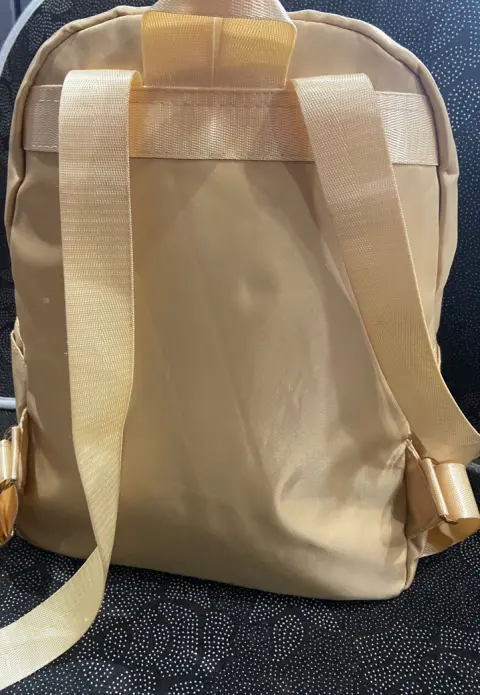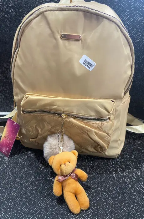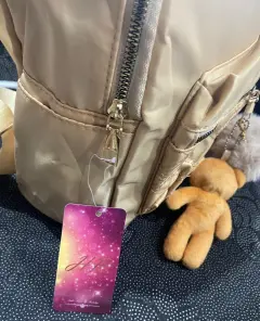 Mochila mostaza/beige oso 🐻 Tipo satin Oso y pompón de adorno