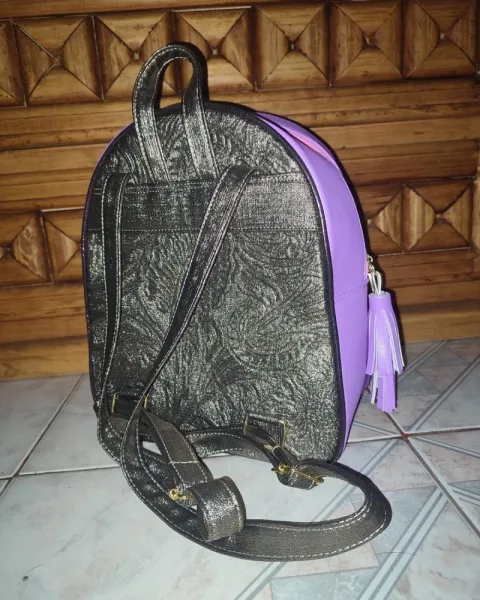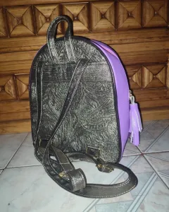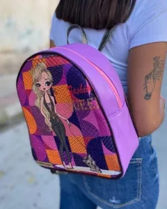 Mochila en vinipiel rosa con yute en impresión de muñeca.