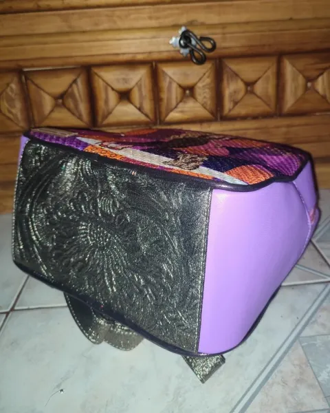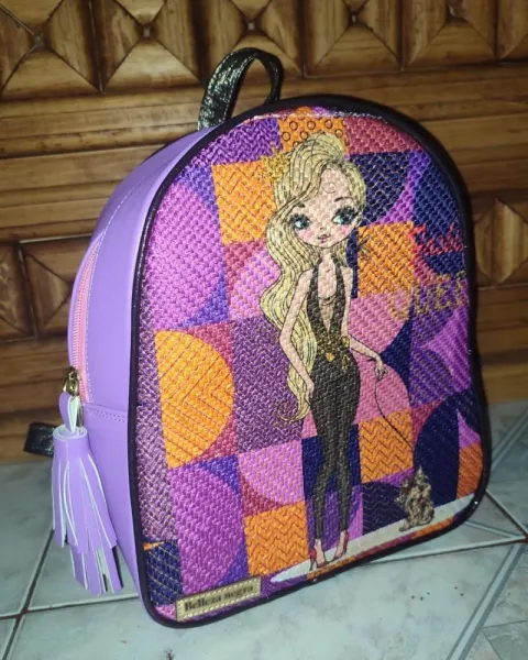 MOCHILA MUÑECA COLORES. Mochila en vinipiel rosa con yute en impresión de muñeca.