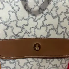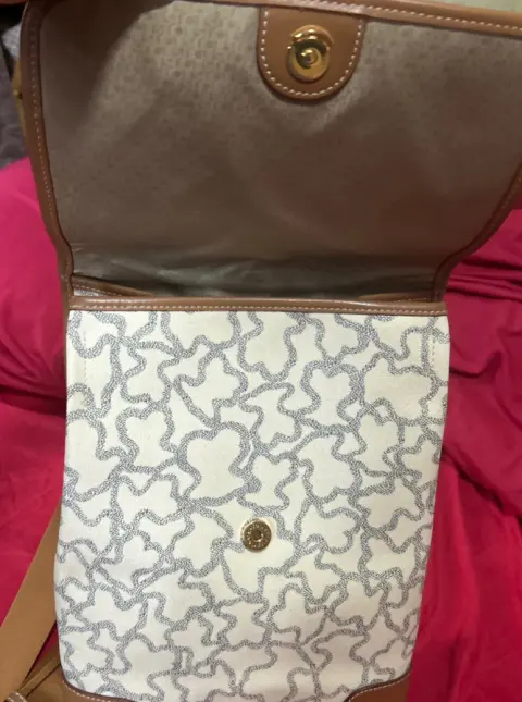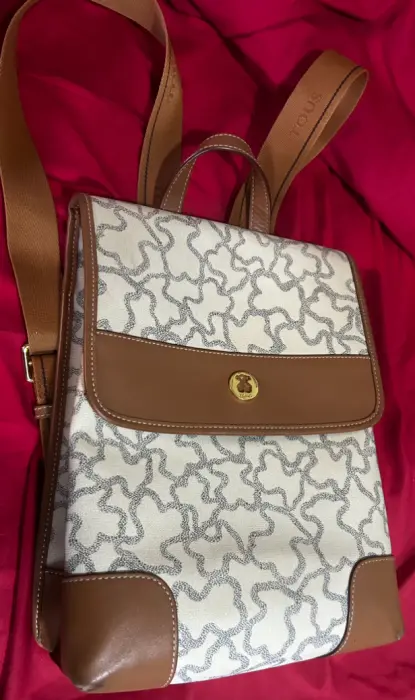 Mochila Tous colección Kaos de lona con estampado beige y gris con de talles de piel sintética, con cierre de solapa magnético, dos bolsos interiores pequeños y bolso interior con cierre de cremallera, asa fija de mano y correas de hombro ajustables. Medidas (alto por ancho por fondo): 34 x 30 x 15. Se entrega con cubre polvo.