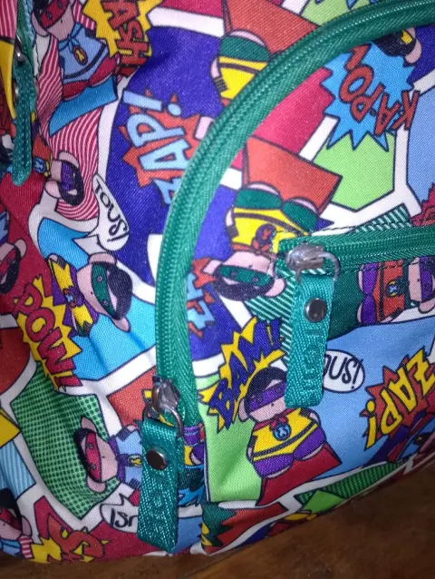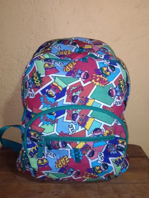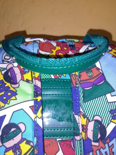 Mochila Tous School Superhero. Mochila mediana Tous School Superhero, por fuera su estética está de 10. Mide 41cm de alto, 33 de largo y la base mide 15cm de ancho.El único detalle que tiene es por dentro (tenía un forro interno como tipo lona blanco y se le fue desprendiendo poco a poco. Pero es por dentro y no se nota. No afecta en nada su uso.