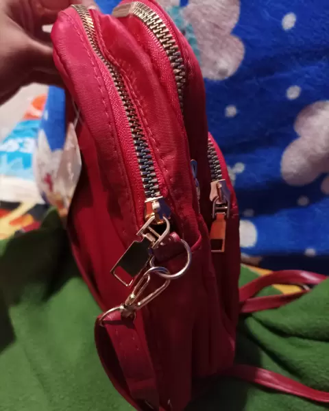 Mochila/Bolso rojo. Mini Mochila/Bolso colo rojo con 3 cierres y correas, práctico para salir a un día casual.