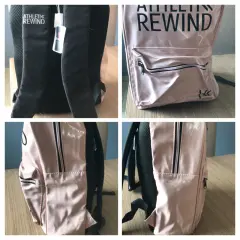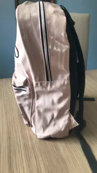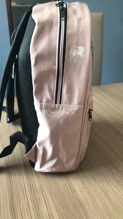 mochila nueva color rosa palo con bolsa adelante tela vinil con estampado tamaño normal