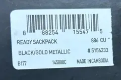 Morral deportivo negro con holograma dorado. Bolsa con cierre por un costado. Jaretas a los lados. Tela 100% poliéster reciclado. Medidas 35 cms de frente 44 cms de alto