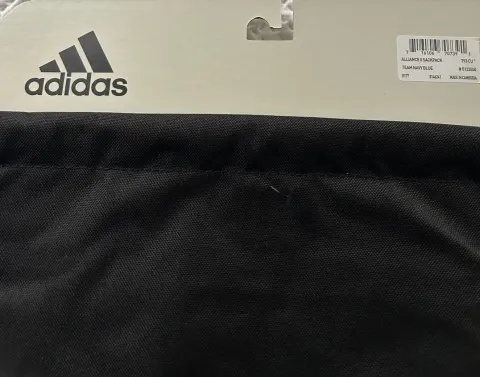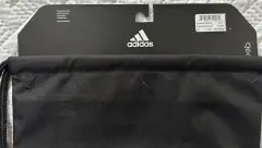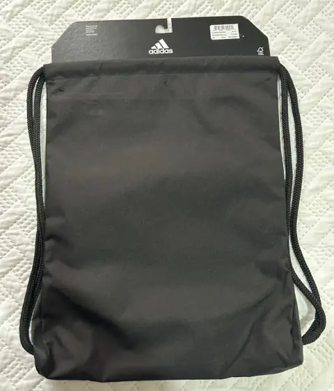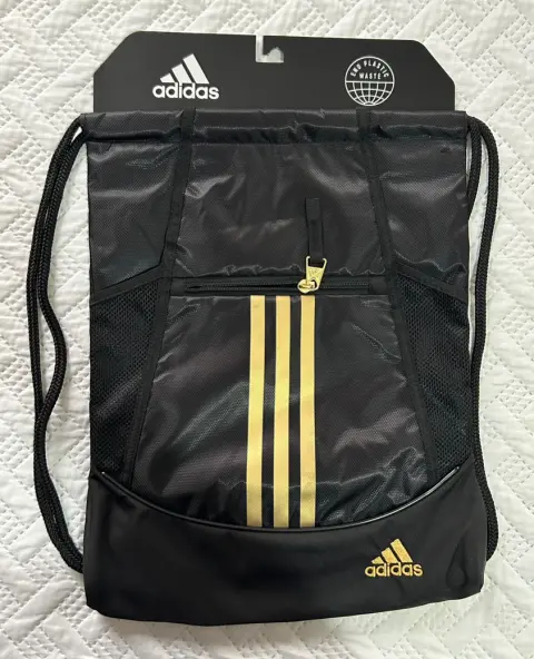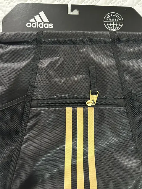 Morral deportivo Adidas negro rayas doradas. Morral deportivo modelo Alliance II Sack Pack con cierre al frente jareta de amarre. Tela 100% poliéster. Medidas 35 cms ancho 46 cms de alto