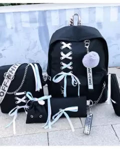 Padrisimo set de mochila, crossbody, cartuchera, monedero, muñequera. material resistente a la decoloracion por el sol. la mochila tiene orificio para auriculares.Tamaño de la mochila: 30x13x41 cm