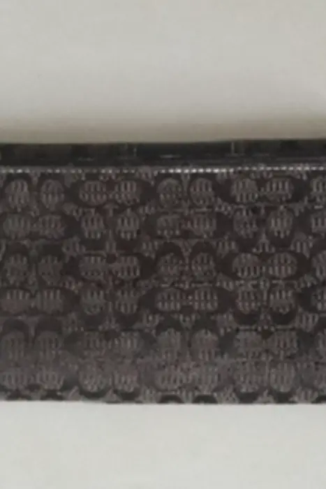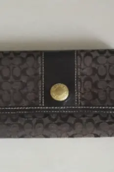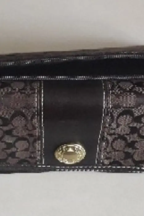 Cartera amplia Coach, tela con piel, color cafe, en excelente estado, sin ningun detalle. tiene para monedas, billetes,varias tarjetas, envio en caja reciclada