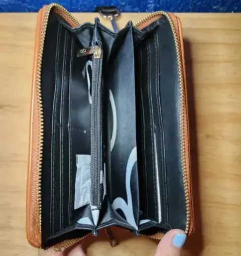 Bonita cartera Cloe color cafe, cuenta con varios compartimentos para guardar billetes, monedas y tarjetas, esta en muy buen estado, los cierres funcionan perfecto :)
