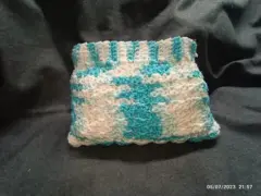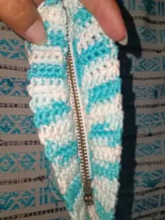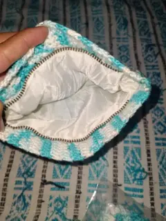 Monedero o cosmetiquera de 19cm x 13cm, color azul claro con blanco, producto nuevo hecho a mano con técnica de crochet, listo para enviar ☺️