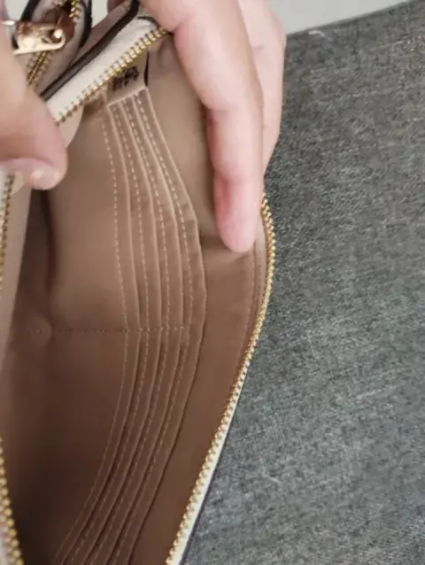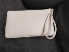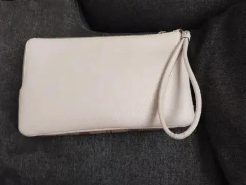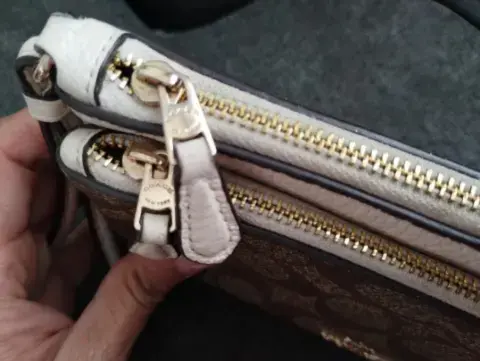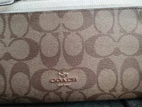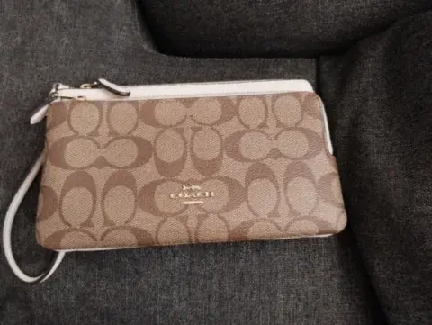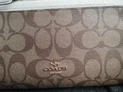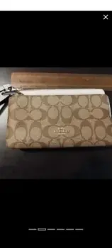 Muñequera coach muy buen estado mínimo uso color café y beige muy amplia cabe un celular .