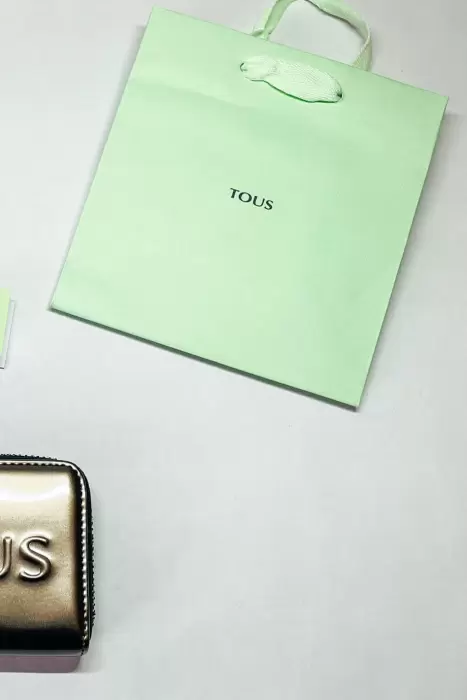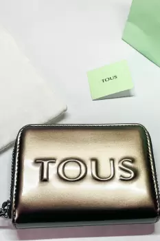 Monedero mediano TOUS en vinilo de efecto cuero y acabado charol con relieve TOUS en color ocre.Lo envío con cubrepolvo y bolsa de papel de la marca.Cierre con cremallera.Cuenta con tres compartimentos y dos bolsillos planos.Medidas: 8 x 11 x 3 cm.