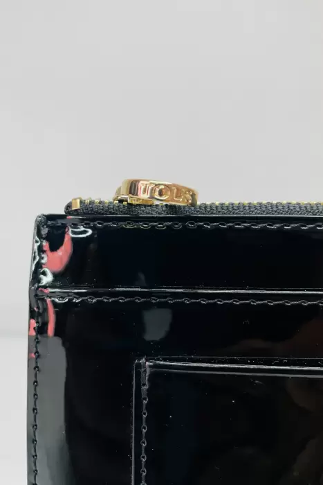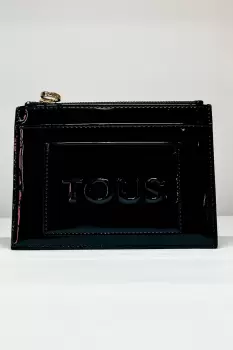 Monedero tarjetero TOUS de efecto charol con relieve TOUS en color negro.Lo envío con cubrepolvo y bolsa de papel de la marcaCierre con cremallera.Cuatro compartimentos para tarjetas y seis compartimentos planos.Medidas: 15.5 x 11 x 1 cm.