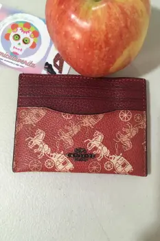 Tarjetera Coach con 6 compartimientos Tarjetero Con Estampado De Caballo Y Carruaje 1984, Rojo Rojo Profundo, Tarjetero de mujer en excelentes condiciones. Lona revestida impresa y ribete de cuero granulado pulido Seis ranuras para tarjetas de crédito.