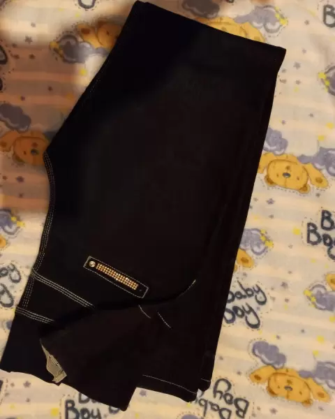 Bello y sobretodo cómodo pantalón de mezclilla ideal para el embarazo, y posterior.De color negro y con detalles de adorno brillante en la parte de atrás.Talla entre 7 a 9, el área de la pancita de bebé es de tela de algodón, muy cómodo.