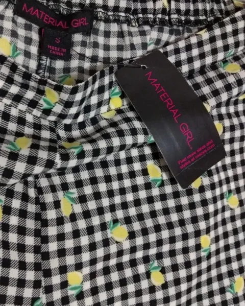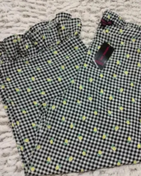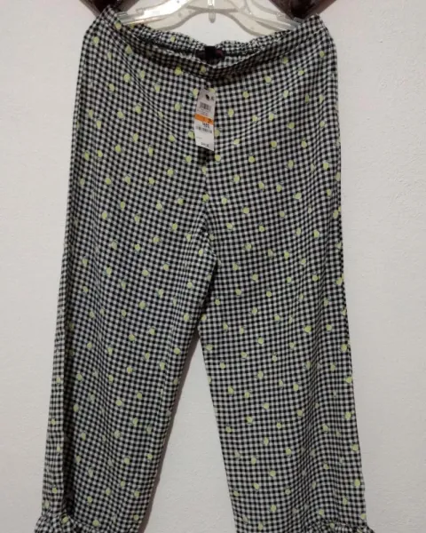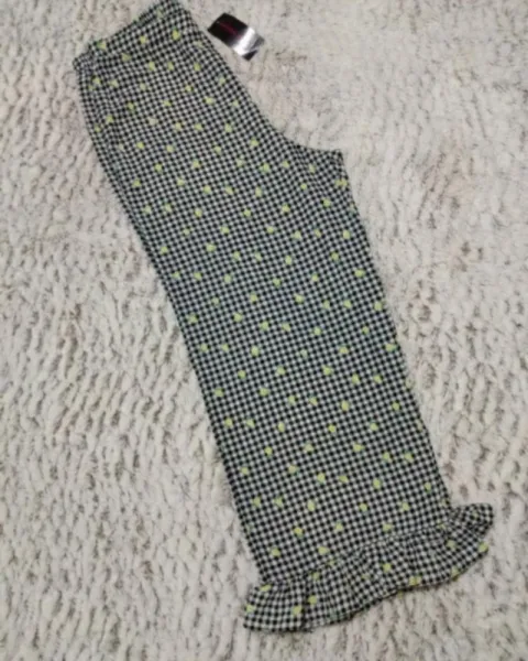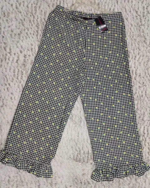 Hermoso y peculiar pantalón Capri, es de cuadritos blanco y negro, y de estampado trae unas pequeñas frutitas, tiene olan en la parte de abajo, se me súper tierno! Talla S, pero queda a M.