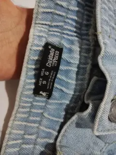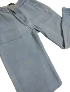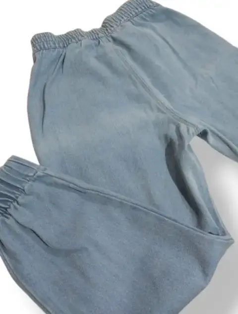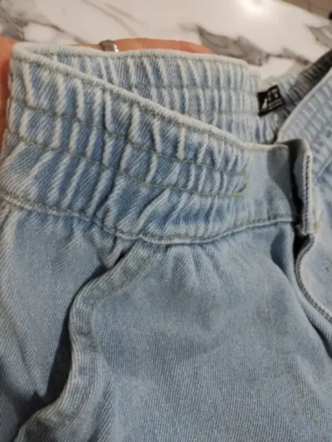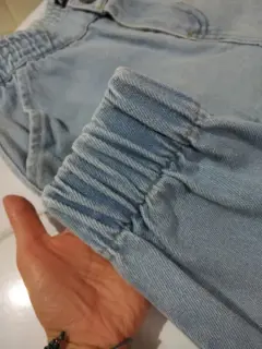 Jeans Mom de mezclilla tipo Jogger, con resorte en la cintura y en la parte de los tobillos, cuenta con bolsas en los costados. Esta en perfectas condiciones, el único detalle es la mancha qué se puede apreciar en la imagen (mancha de cloro). El resto de el jeans se encuentra en buen estado.Cintura 90 cmAltura 90 cm