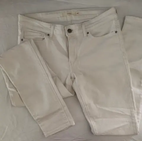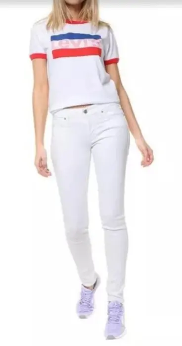 Jeans Skinny blanco Levi's. Es blanquito blanquito, sin detalles ni manchas 😊Marca talla 29 pero viene un poco amplio, considero que una talla más grande.Corte skinny.