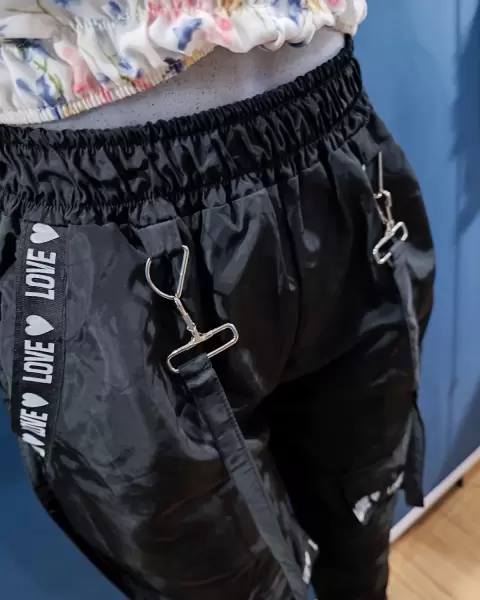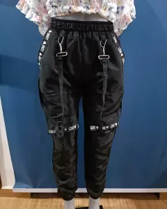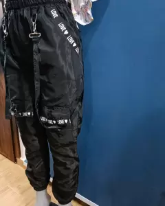 Jogger/Cargo nuevo color negro. Está completamente nuevo, tiene bolsas y la tela es tipo rompe vientos. Viene reducido a una CH cuenta con elastico en los tobillos y es de tiro alto