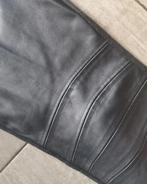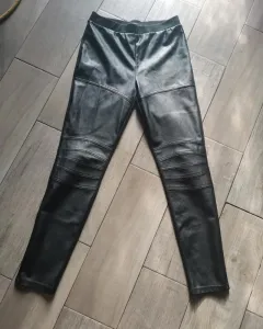 Bonito legging en tela de vinipiel solo por la parte de adelante, la parte de atrás es de tela de polyester, tiene un poco de bolitas pero ya puesto ni se nota, esta muy bonito.