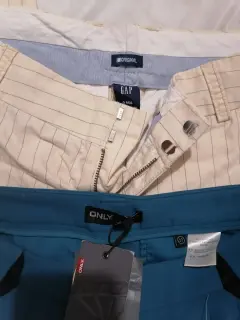 Es un pantalon beige con rayas gap de vestir, 1 pantalon de vestir color azul solo trae un pequeño hoyo en la parte de arriba del pantalon, 1 vestido negro old navy y un vestido strapless Gap los dos son cortos para que armes tu oufit todo está en buenas condiciones queda a talla chica, cualquier cosa puede preguntar, armo paquetes a buen precio 💯❤️💙🧡
