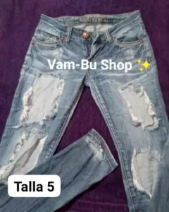 Pantalon de mezclilla deslavado y desgarradoTipo boyfriendCon presillas y bolsas traseras y delanterasTalla 5Marca L.A. idolBlusa manga largaCuadros Esmeralda/NegroA botonesTalla MPantalón usado, blusa nueva sin etiqueta