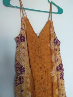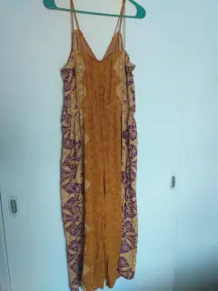 Palazo color mostaza,estampado,sin mangas con tirantes,a 3/4 de la pierna.,con botones al frente