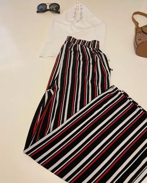 Pantalón acampanado. Pantalón rayado en colores negro, rojo y blanco, resorte en cintura, tiene una hermosa Caída, es acampando.