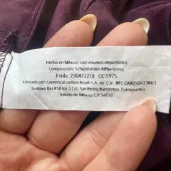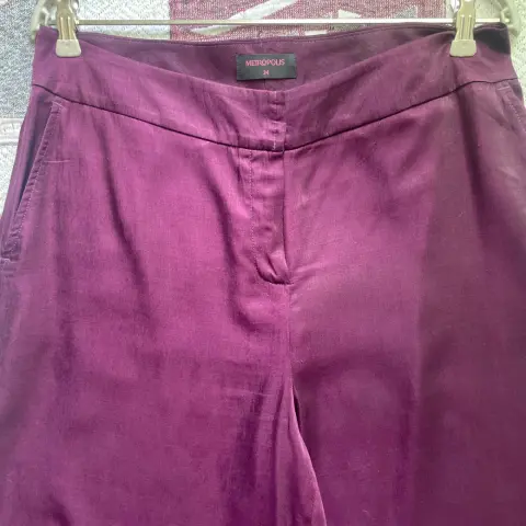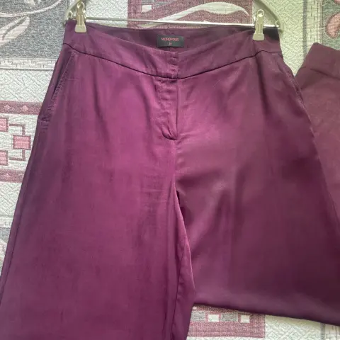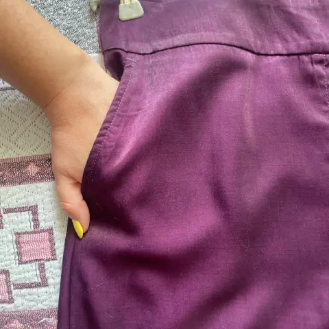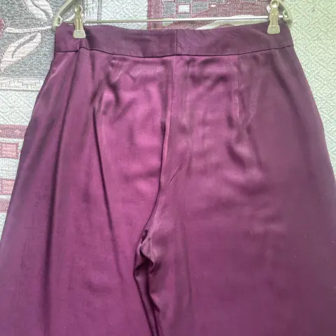 Pantalón amplio de pierna ancha.Con dos bolsillos al frente, amplios.Luce elegante a la vez que es súper cómodo.La tela es fresca, brillosa. Da efecto aterciopelado.Talla 34 o grande. (Yo mido 80 cm de cintura y me queda un poco suelto).Color morado uva.52% poliéster y 48% viscosa.