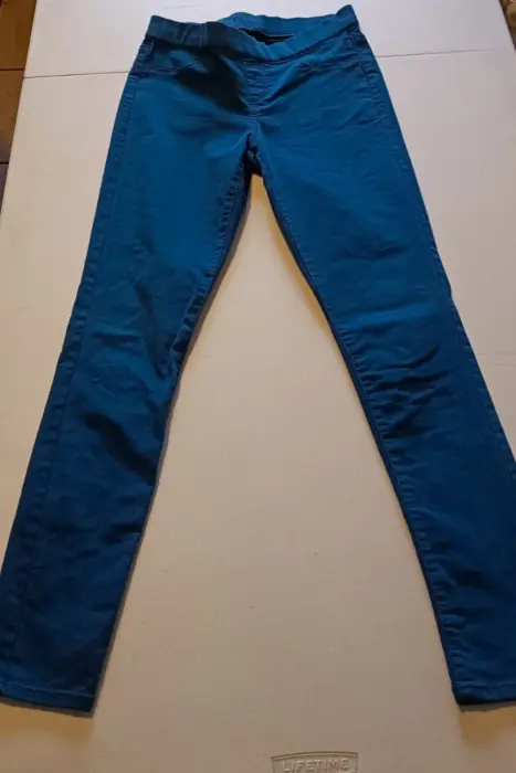 Pantalón tipo jegging color azul verde o aqua.No tiene bolsas, son aparentes, pero si tiene bolsas traseras.
