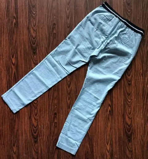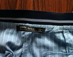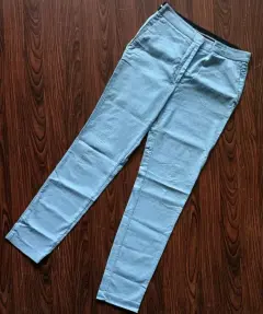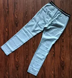 Pantalón de vestir y casual con resorte, con bolsas atrás y adelante. Es azul cielo y tiene como cuadritos blancos.