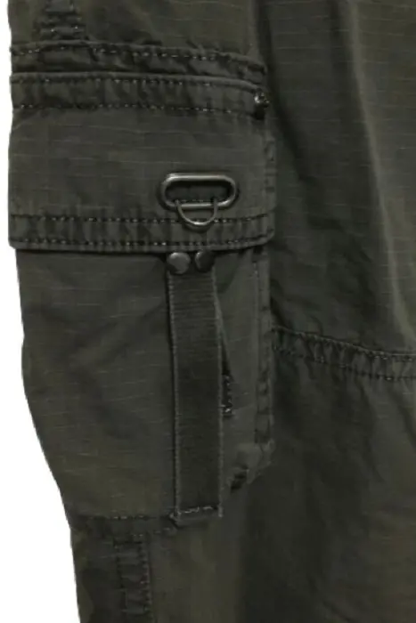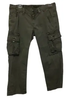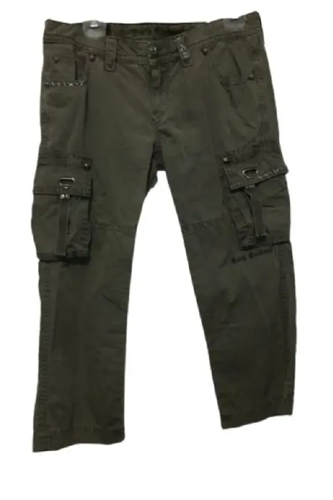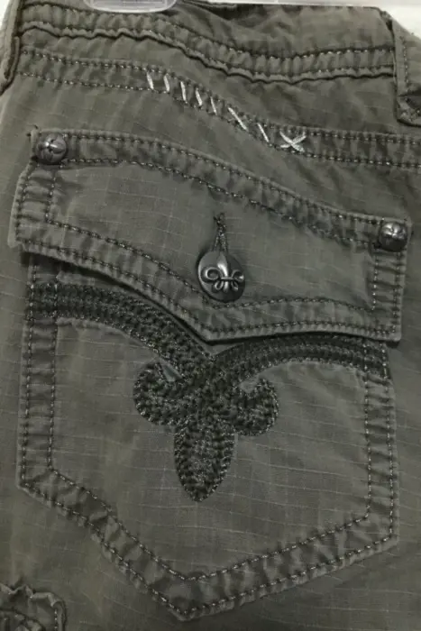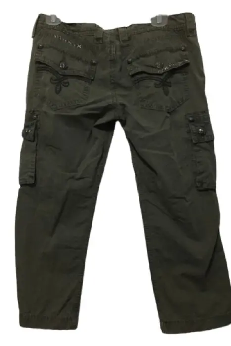 Pantalón baggy corte a la cadera (muy bajo), corte capri - pescador (medio muslo). Color entre verde militar y gris, la tela tiene un sutil estampado de malla. Marca Rock Revival, dice talla 30 EU (XXXS) pero queda a S-M. Bolsas a los costados, frente y parte trasera con detalles en bordado, completamente nuevo.