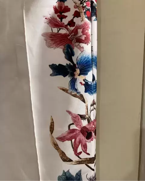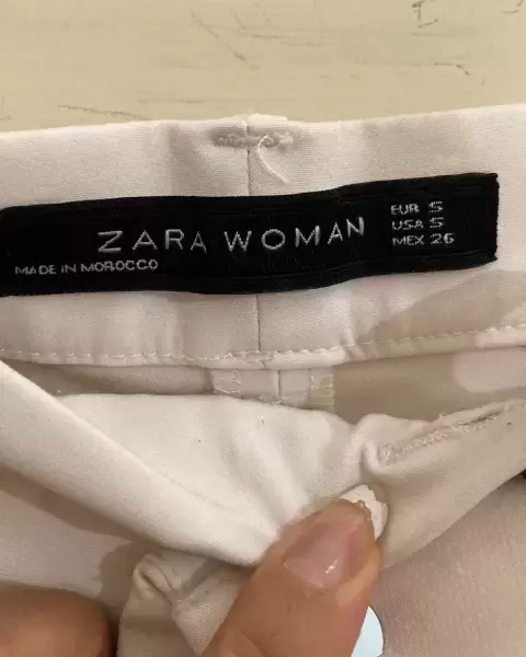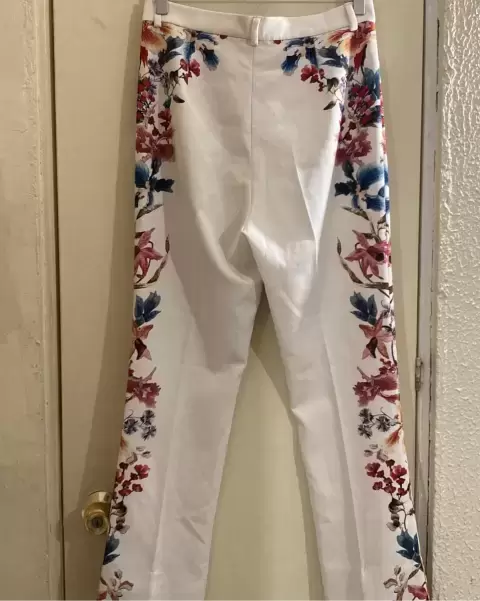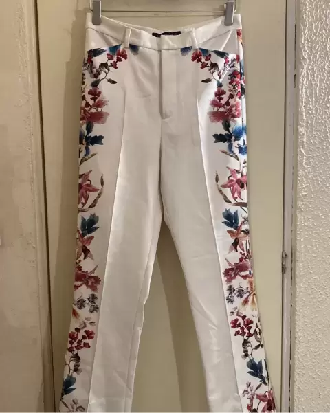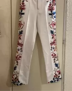 Pantalón blanco con flores a lis costados, talla 26, presillas para cinturón