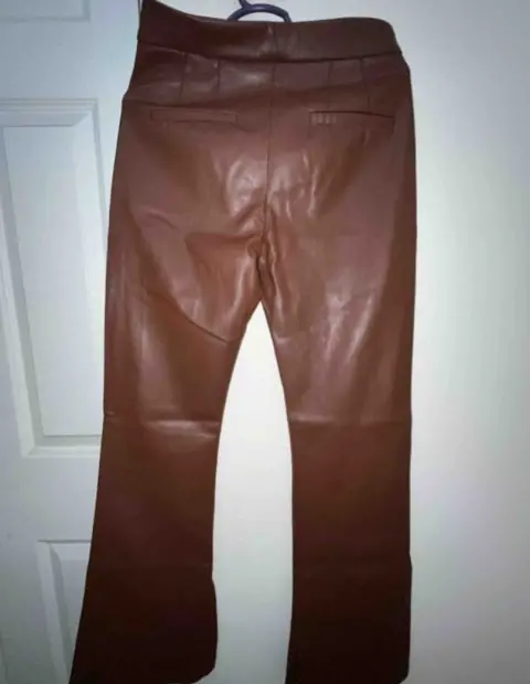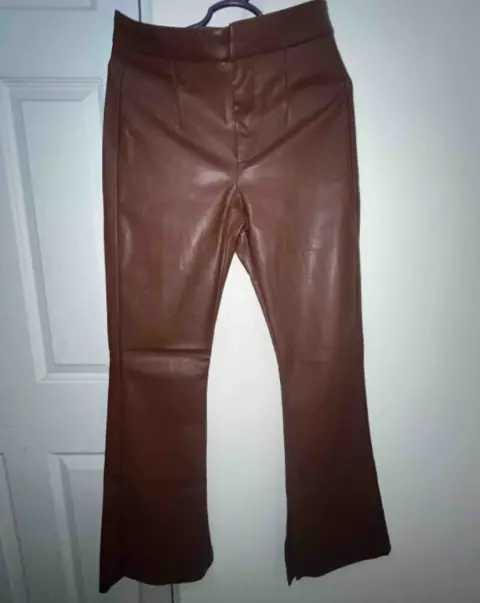 Pantalón tipo polipiel café, ancho con abertura en la parte de abajo, amolda perfecto, Bershka talla 26