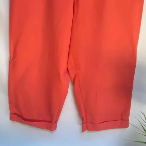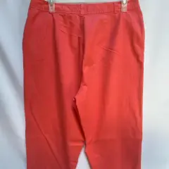 Pantalón Capri color salmón rosado. Pantalón Capri color salmón rosado en tela algodón tipo pana con caneleta, corte a la cintura y bolsas delanteras en corte diagonal con botón. Cierre y botón en Pretina; pinzas en la espalda. Valenciana en ambas piernas, corte recto. Talla: M (30-32) Puede quedar hasta una talla L. Marca: KAREN SCOTT.