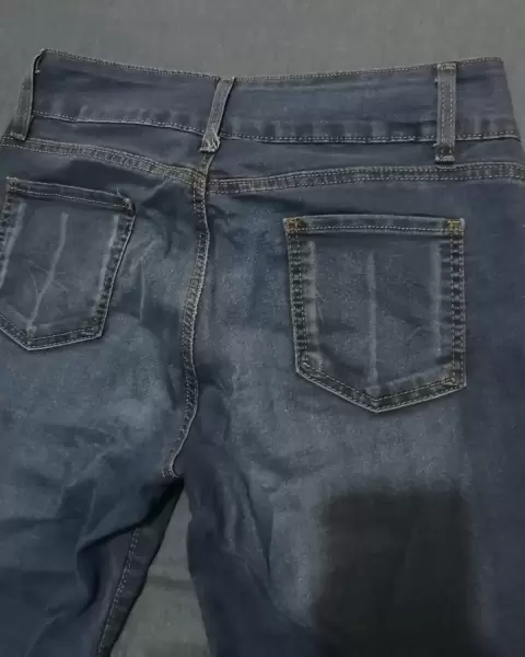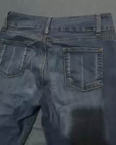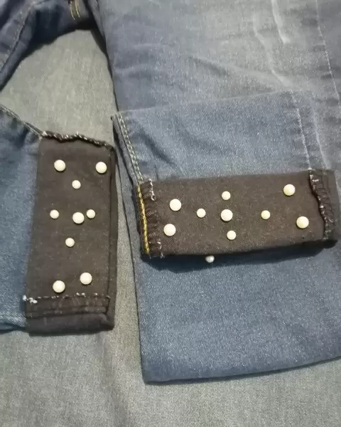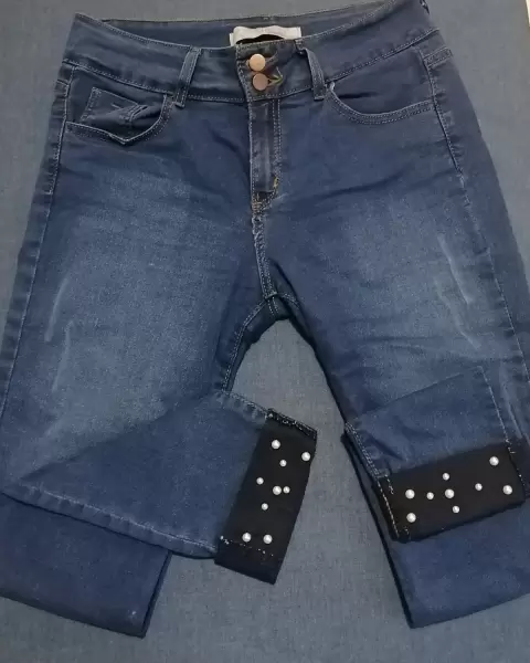 pantalón con lindo detalle de perlitas. pantalón de mezclilla tiro alto a la cintura color azul oscuro con lindo detalle en la parte baja de las piernas con perlitas es talla 13 y se encuentra sin detalles en perfectas condiciones