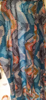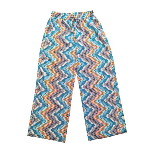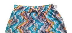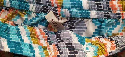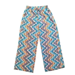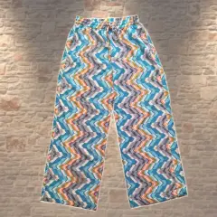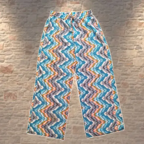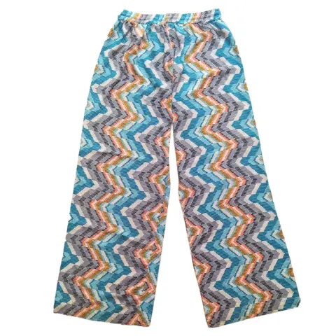 Pantalón culotte de grecas. Pantalón a la cintura, silueta culotte terminado con pierna ancha. Cuenta con elástico que estira bastante, es fresco y vaporoso. Lo aconsejo para playa o evento en un jardín, la tela es delgada. Marca Elan.Contorno cintura: 72 cm estira a 94 cm.Contorno cadera: 126 cm.Tiro: 26 cm.Ancho de pierna: 31 cm.