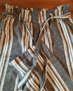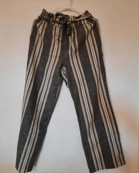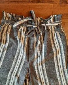 Pantalón de Lino, cintura gris/blanco. Pantalón de lino, sueto talla M, xuenta con resorte a la cintura y un cordón para hacer un moño, tiene un largo de 101cm