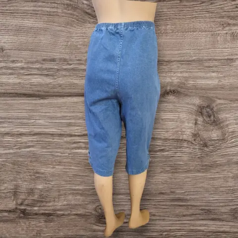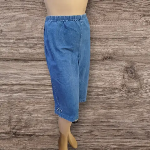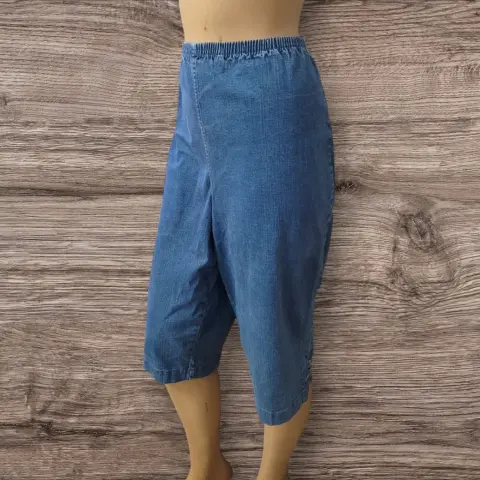 Pantalon De Mesclilla Capri Croft & Barrow, stretch, talla 1X, color azul deslavado, cintura elástica, estilo liso, detalle metalico en parte baja, hecho de algodón y elastano, mide 39cm de cintura, 53cm de cadera, 36cm de entrepierna con 65cm de largo de la cintura hacia abajo en buen estado cosmetico.