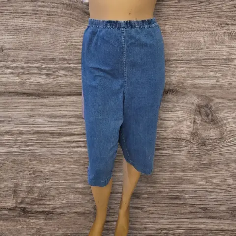 Pantalon De Mesclilla Capri Croft & Barr. Pantalon De Mesclilla Capri Croft & Barrow, stretch, talla 1X, color azul deslavado, cintura elástica, estilo liso, detalle metalico en parte baja, hecho de algodón y elastano, mide 39cm de cintura, 53cm de cadera, 36cm de entrepierna con 65cm de largo de la cintura hacia abajo en buen estado cosmetico.