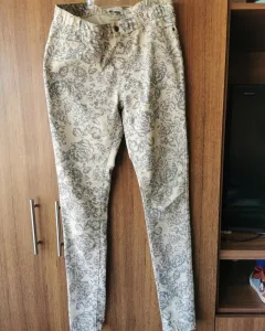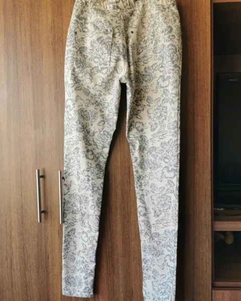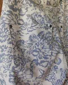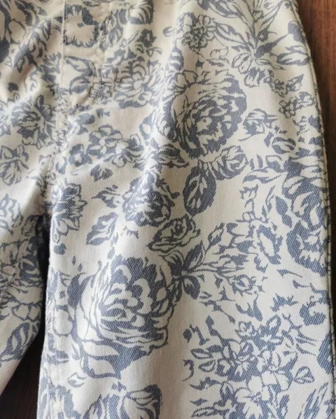 Pantalon de mezclilla beige con flores azules no tiene cierre, sin detalles