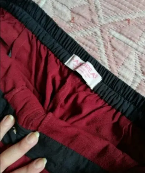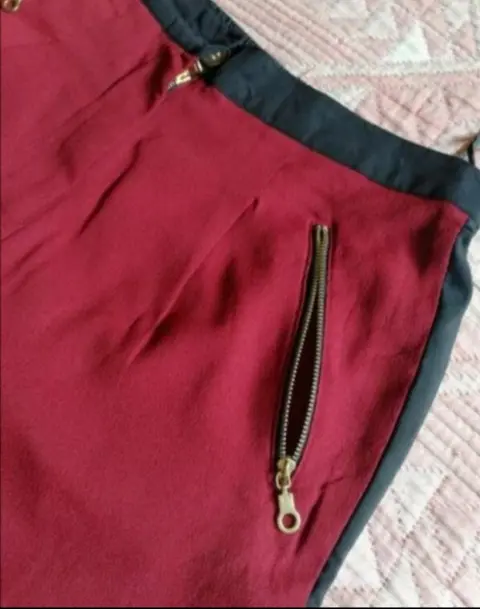 Pantalón color vino con frangas en los costados corlo negro, es nuevo, trae en la parte de atrás resorte y en la parte de adelante trae bolsillos.