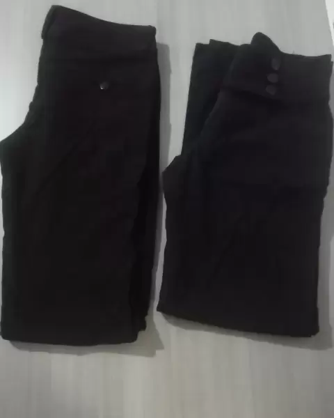 Bonitos pantalones de estir en tono negro, la tela es licra y amoldan super bonito al cuerpo, el corte es recto, uno de ellos presenta un pequeño detalle en la parte trasera del pantalon pero no afecta en nada, es casi invisible, lo muestro en la ultima foto.Estan super bonitos!!!Uno es marca nicholas el otro sin marcaAmbos son talla 32