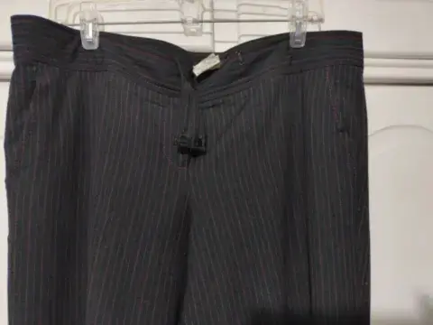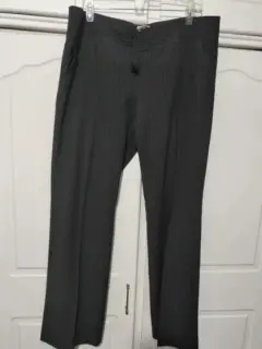 Pantalón de vestir a la cadera con dos bolsas al frente de cintura mide 48 CM de cadera 57 CM de largo 102 CM color gris Oxford con líneas en color vino y grises único detalle le falta un broche parte de abajo un poco ancho