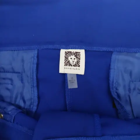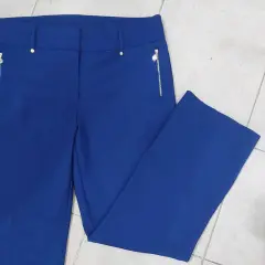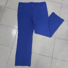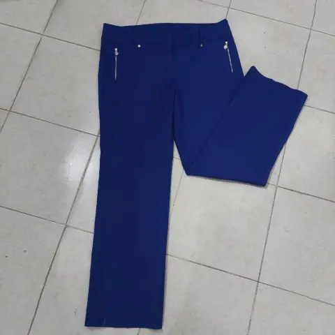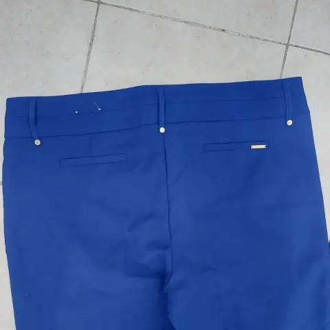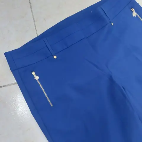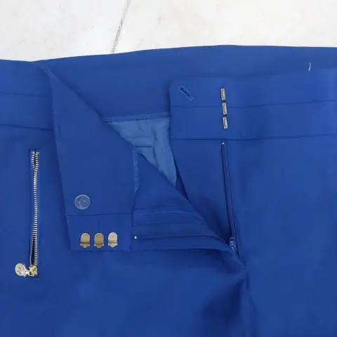 Pantalón de vestir color azul marino con detalles en dorado, los cierres de las bolsas conservan su empaquetado y es completamente nuevo, tiene bolsas funcionales y tiene clips para abrocharse y un botón interno