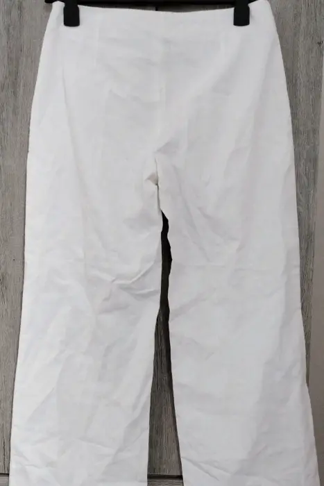 Pantalón de vestir Blanco Petite. Pantalón talla 8 color blancoTipo de playa, es 80% algodón 20% poliéster (El pantalón no estira)Al parecer es largo acampanado a la caderaCierre por un lado.