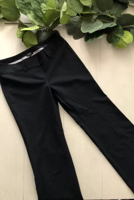 Pantalon de vestir negro. Pantalon negro de vestir, corte recto y amplio sin ser acampanado, viene con dos mini bolsillos enfrente y bolsillos con boton detras, trabillas para cinturon, boton y cierre. Dice talla cuatro, pero parece 6-7Medidascintura: 84 cmcadera: 96 cmlargo: 102 cm