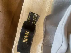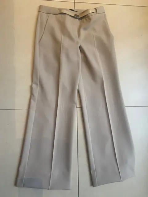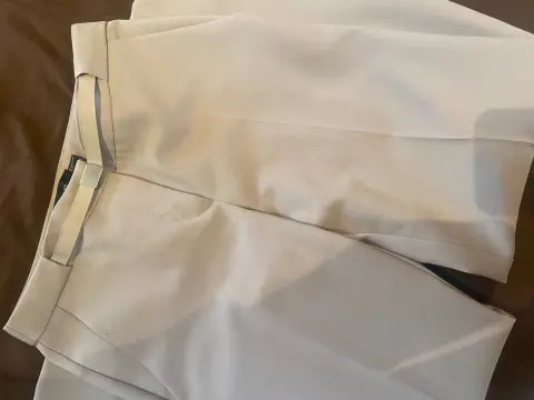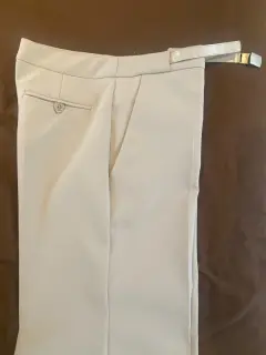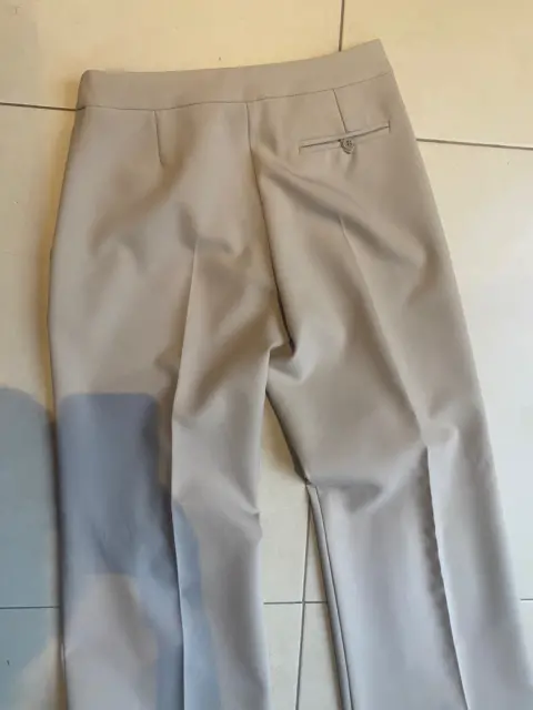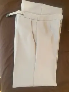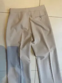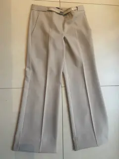 Hermoso pantalón de vestir recto con raya marcada y cinturón . Es color beige/crudoTiene bolsillos laterales y uno trasero. Mido 1.60 y le subí la bastilla a esa medida. Todavía se le puede bajar más .Fue una prenda consentida . En perfecto estado!