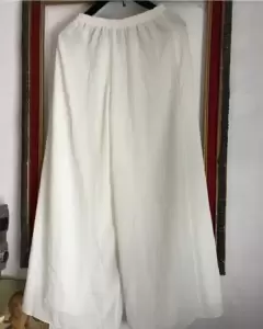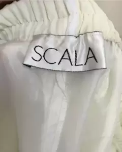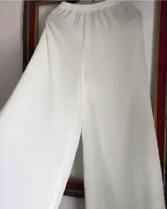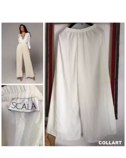 Pantalón elegante pierna ancha. Pantalón color hueso ligero wide leg con forro y resorte en la cintura. Marca: Scala talla M pero considero que le va mejor a una talla L. Es largo y a mi no me quedo siendo que soy M, pero mido 1.55.Medidas:Cintura: 33 cm ( estira hasta 44 cm)Largo: 105 cm