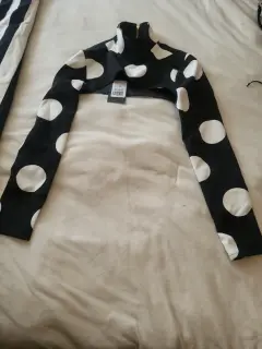 Pantalón entero con totera. Pantalón entero a rayas blanco con negro cierre en la parte se atrás torera negra lunares blancos cierre atrás cuello alto se entrega en paquete original