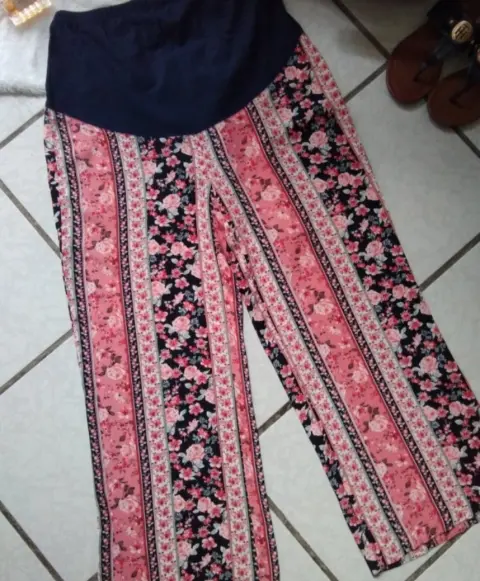 Pantalón Floral de Maternidad. Es un pantalón hermoso, súper ligero, tela tipo rayón con hermoso estampado y combinable, te va a encantar! Talla M; el detalle que tiene se muestra en la 5ta foto, al cortar la etiqueta se le hicieron dos hoyitos, está remendado, pero no afecta en lo absoluto por la blusa, porque los tapa sin problema. Te dejo medidas, cintura: 37 cm, cadera: 54 cm y largo: 103 cm.